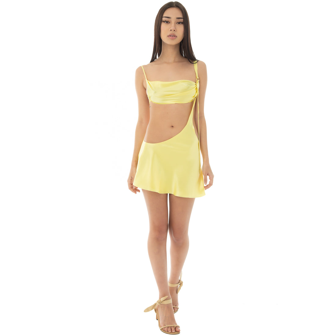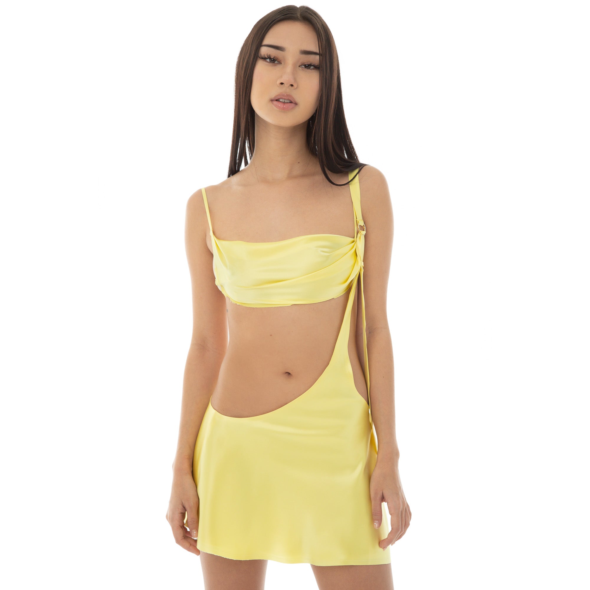 A heavenly abbreviation. Kyften caresses asymmetry in silk, with an adjustable buckle strap for optimal draping.