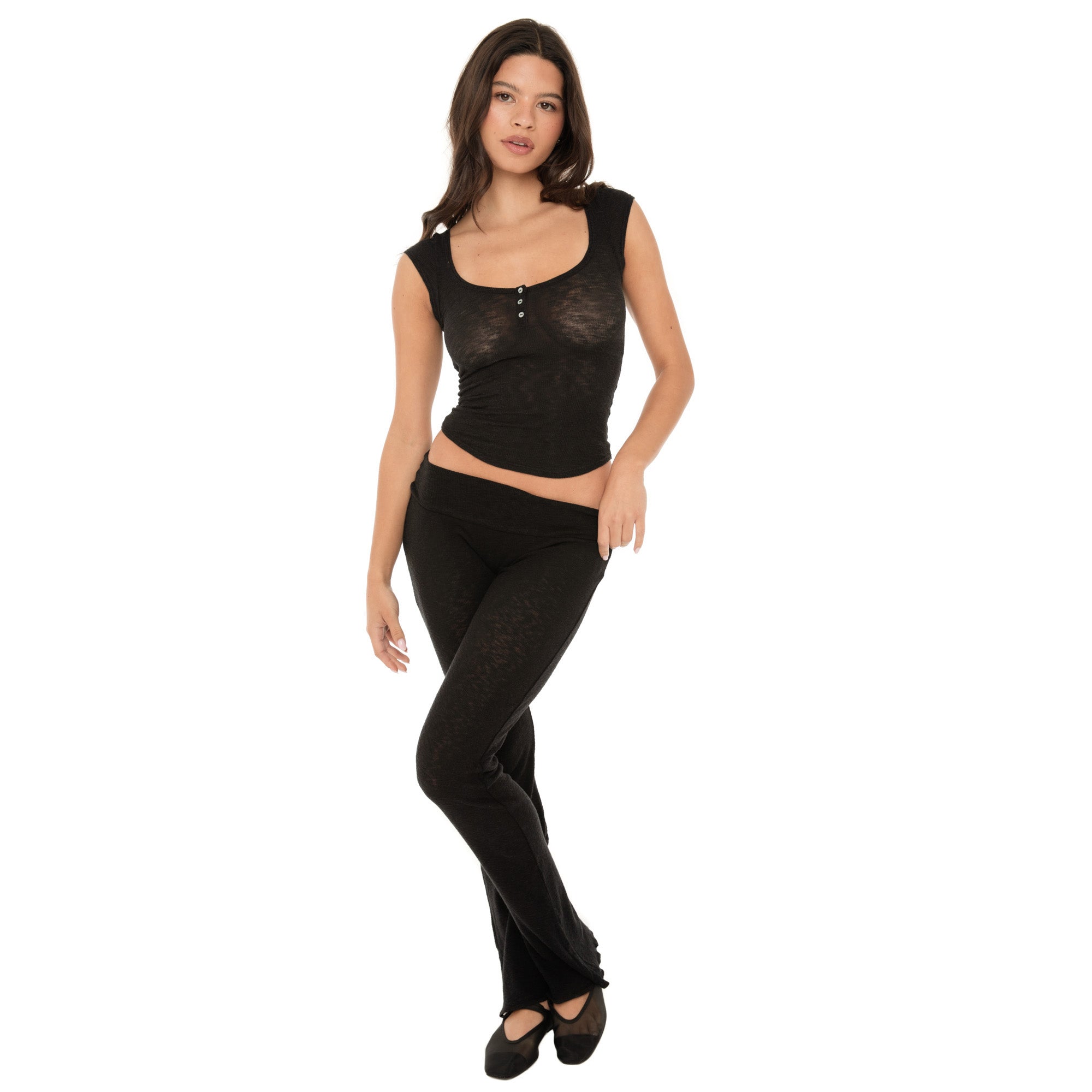 Nostalgia updated. Khara is a cap sleeved henley tee with a perfectly curved hem and mother of pearl buttons. In our signature tissue rib.