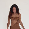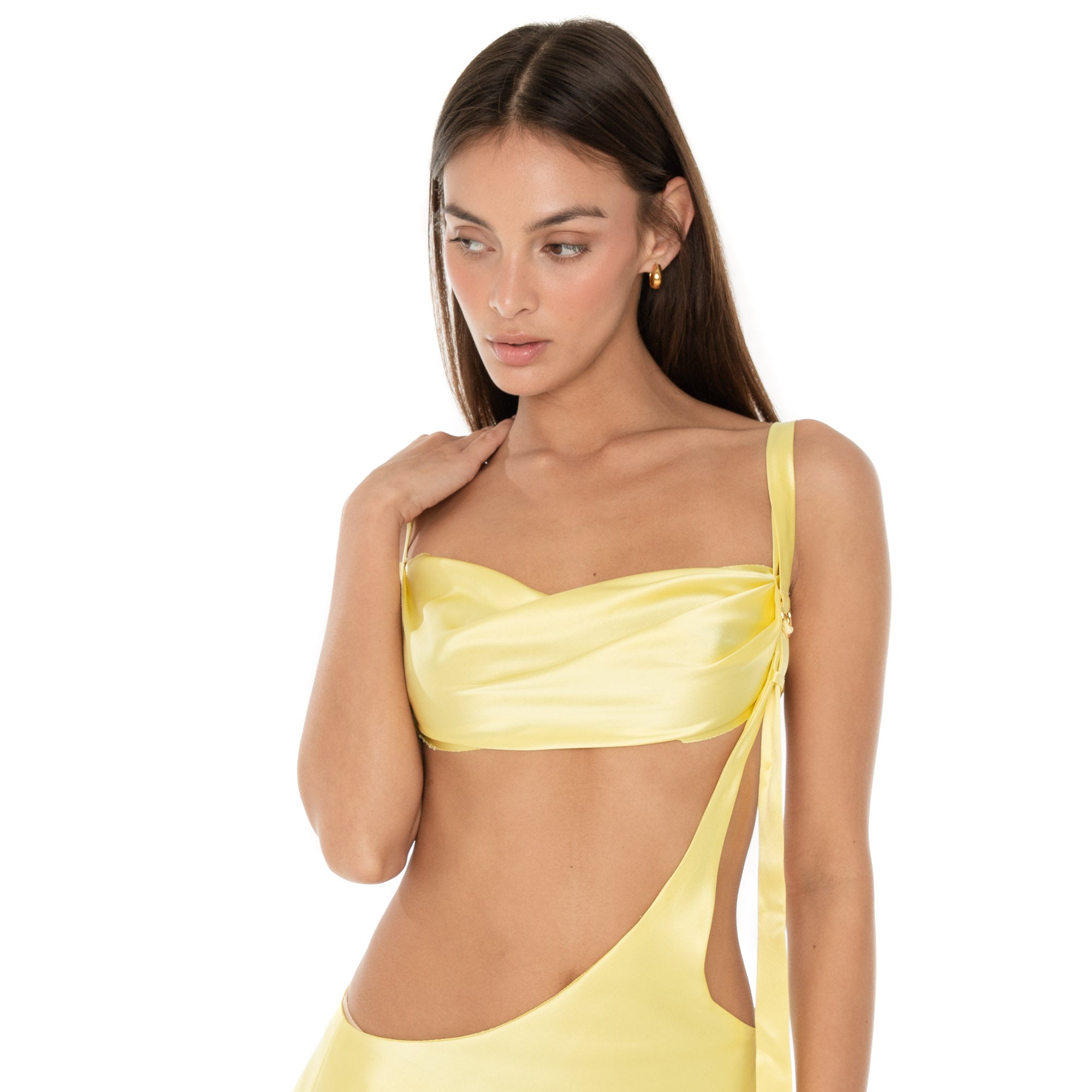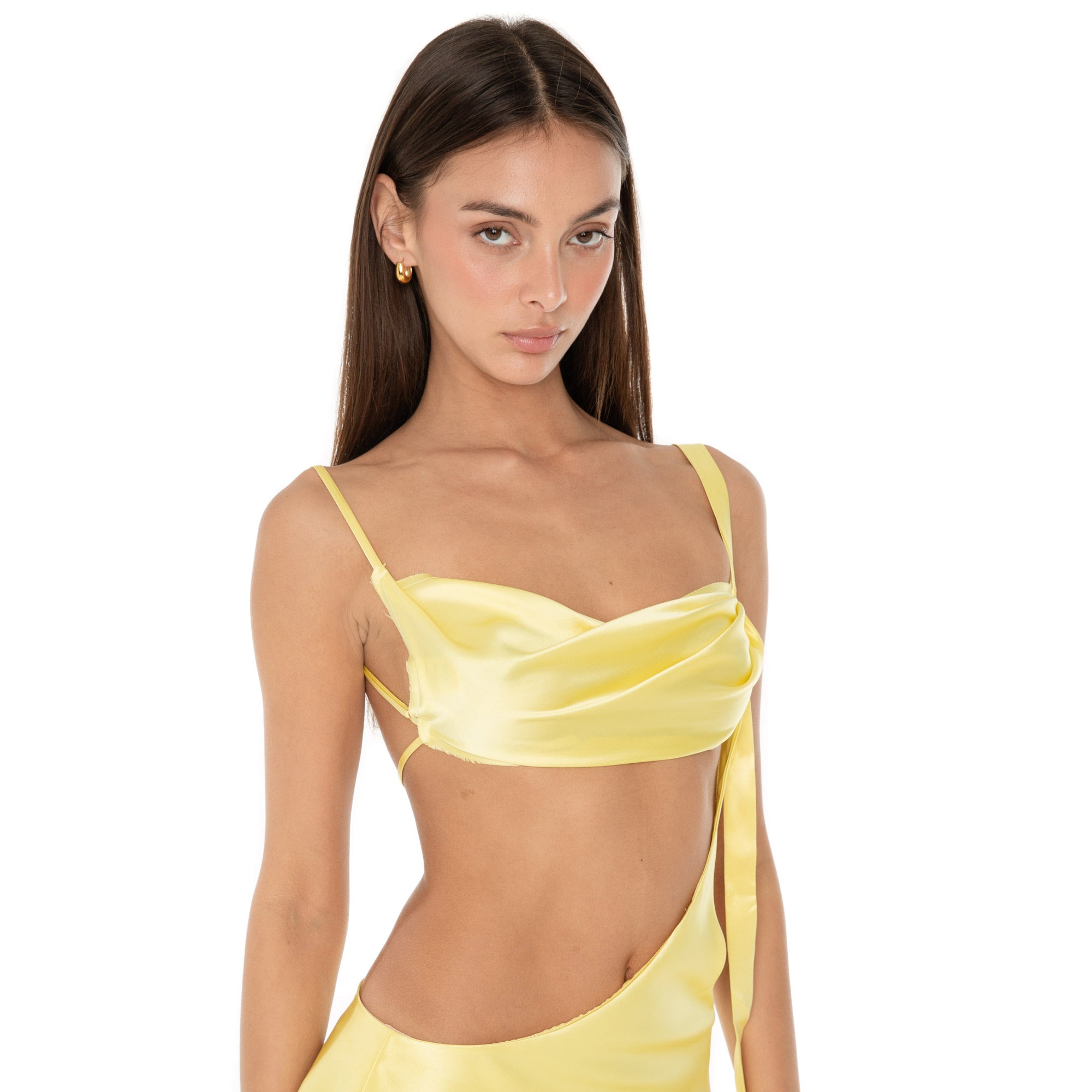 A bra top so empyreal. Cai caresses asymmetry in silk, with a cowl neck and a barely there back strap.