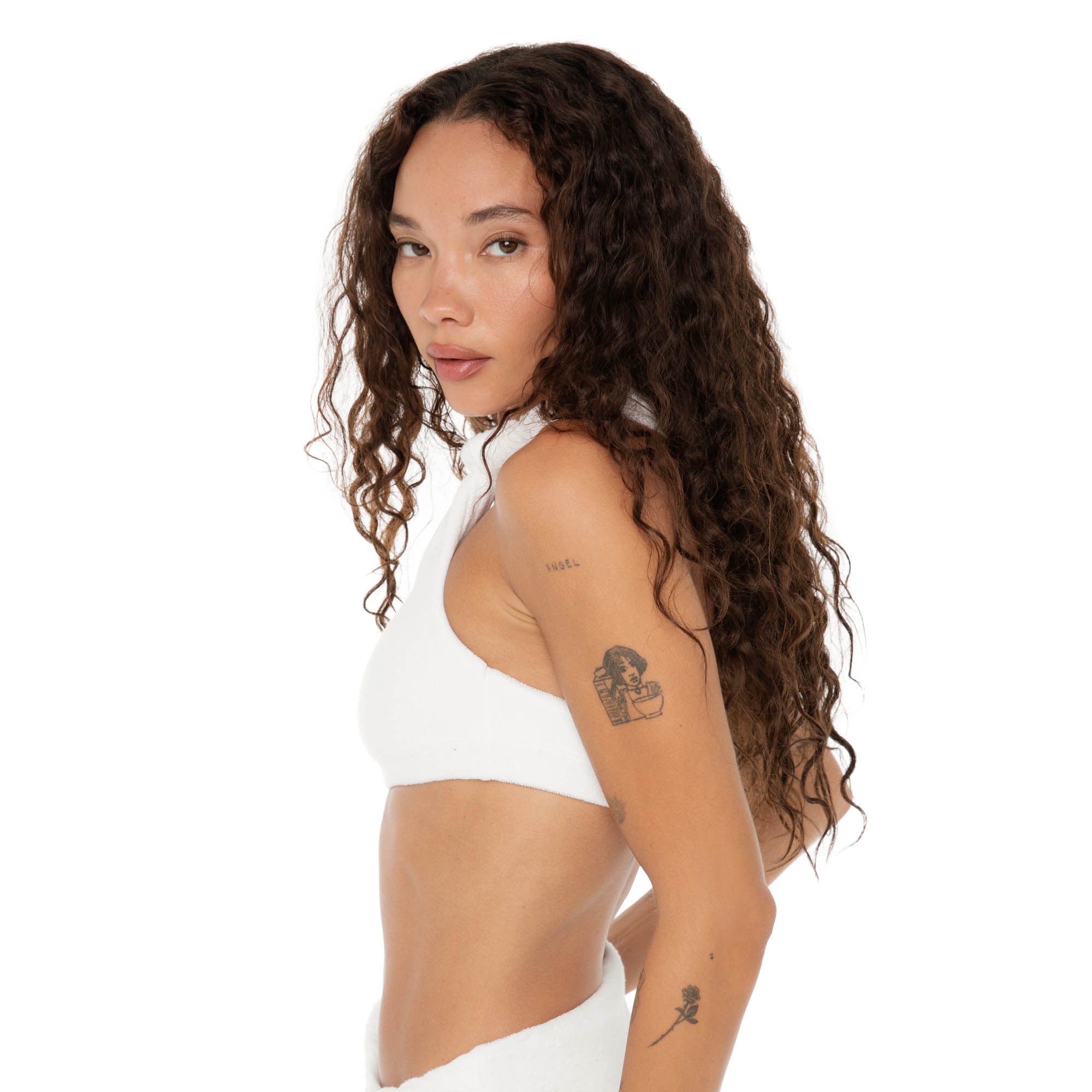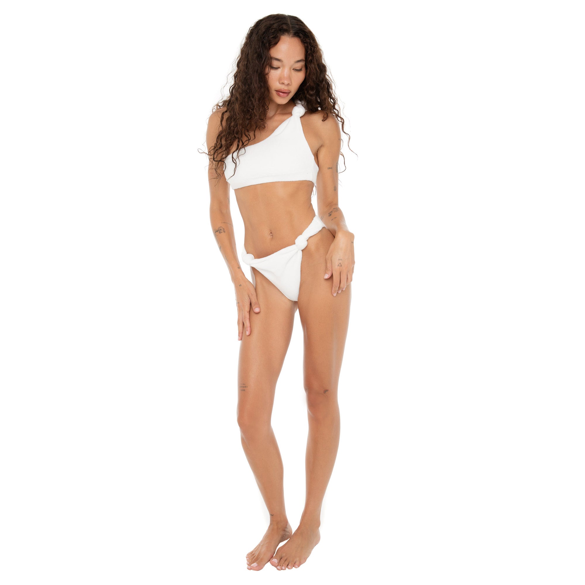 A homage to being pool-side, no water necessary. The knotted strap is complimented with an elastic hem for a fresh silhouette. Perfect for poolside but intended as loungewear, not fit for swim. Wash with like colors only.